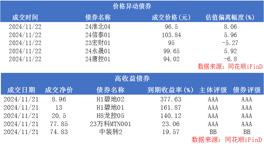 资金方面,11月22日,银存间1天质押式回购(DR001)开盘报1.4505%,上日加权平均价报1.4478%;银存间7天质押式回购(DR007)开盘报1.7950%,上日加权平均价报1.5492%。