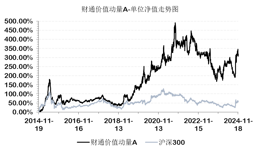 他在2014年11月19日接手财通价值动量A,十年间共实现319.29%的回报,对应年化回报15.39%,同期沪深300涨56.48%,年化回报4.57%。