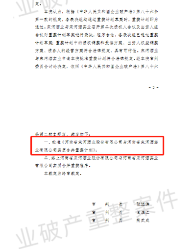 据获批草案显示,本院查明,2023年6月19日,本院裁定受理河南省宋河酒业股份有限公司与河南省宋河酒实业有限公司的重整申请。2023年7月12日,本院裁定对宋河酒业与宋河酒实业实质合并重整,并指定北京市金杜(深圳)律师事务所和河南融源清算服务有限公司担任宋河酒业与宋河酒实业实质合并重整管理人。