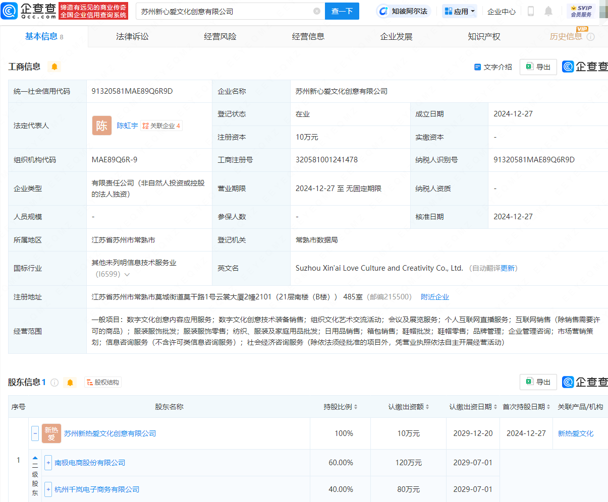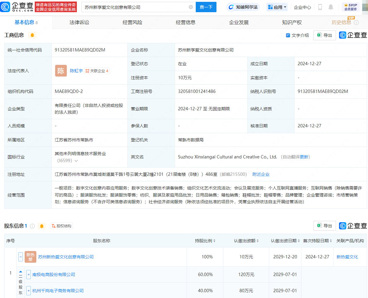 企查查APP显示,近日,苏州新心爱文化创意有限公司、苏州新享爱文化创意有限公司成立,法定代表人均为陈虹宇,注册资本均为10万元,经营范围均包含:数字文化创意内容应用服务;数字文化创意技术装备销售;个人互联网直播服务;互联网销售;服装服饰批发等。企查查股权穿透显示,两公司均由南极电商(002127)旗下苏州新热爱文化创意有限公司全资持股。