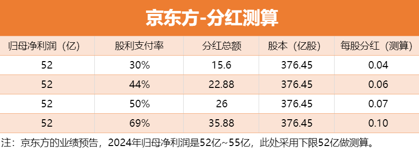 那现在的情况,京东方的归母净利润,差不多知道了,是52亿~55亿。那我们就可以根据不同的股利支付率,来测算2024年度有多少分红,就是这个表。