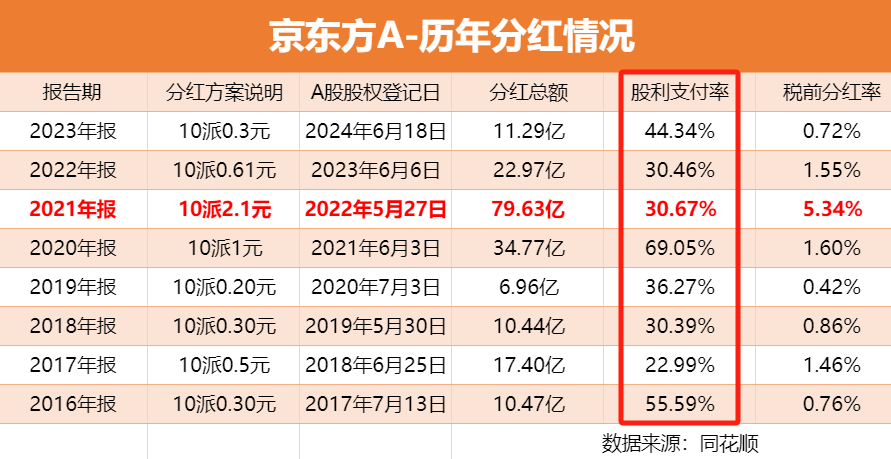 30%的股利支付率,这个相当于是底线,京东方的分红,绝大多数是高于30%的。所以,每股4分钱以上,这个是我们可以期待的。