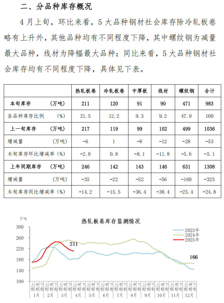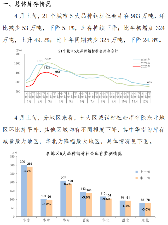 根据中国钢铁工业协会发布的2025年4月上旬及3月中旬行业数据,4月上旬,21个城市5大品种钢材社会库存983万吨,环比减少53万吨,下降5.1%。
