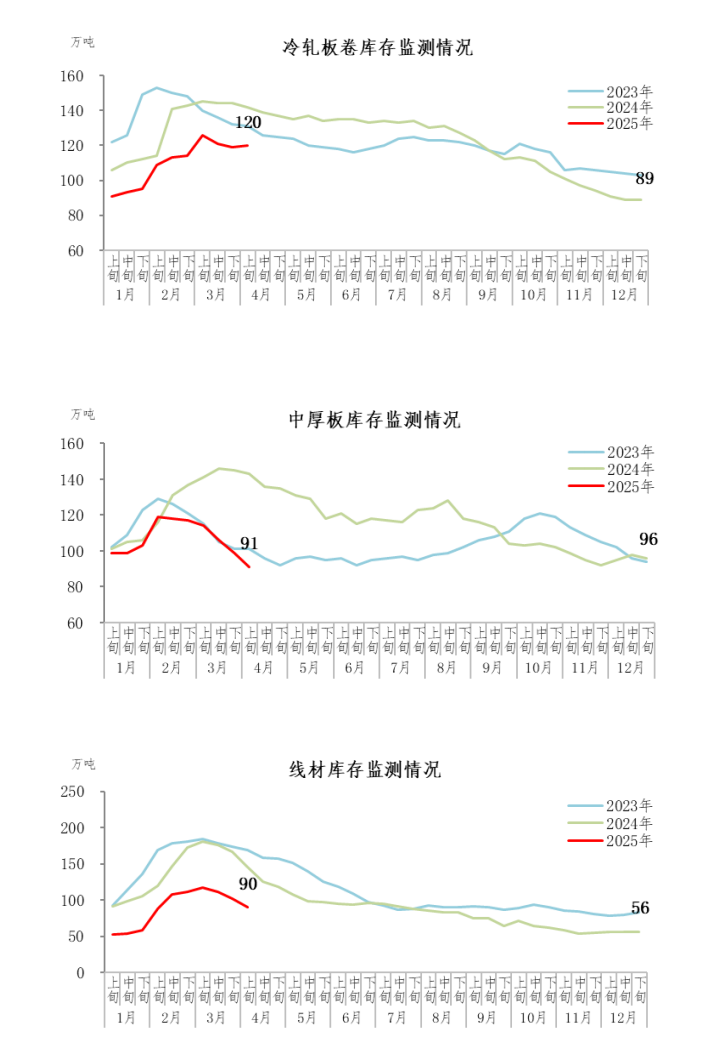 2.制造业补库:家电、汽车、船舶等制造业进入生产旺季,且第一季度出口量持续走高,热轧和冷轧板卷需求增加,但受关税影响,板材出口订单阶段性走弱,导致库存降幅分化。