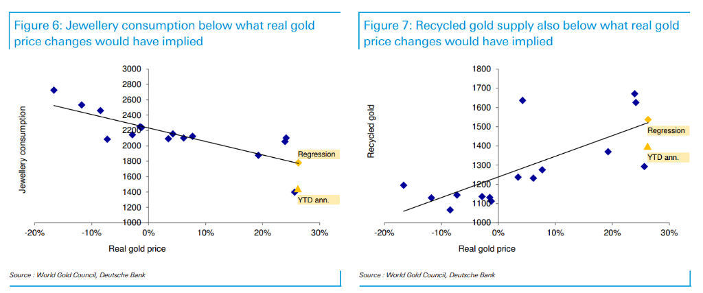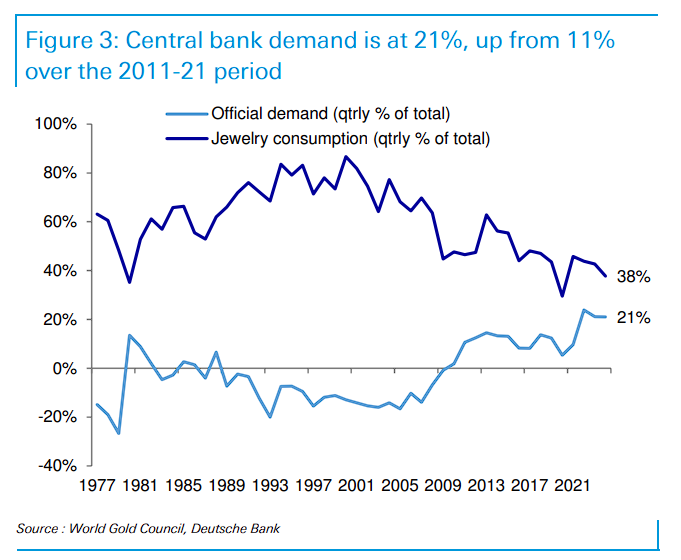 德银表示,这种需求结构的变化成为推动金价上涨的关键因素,也压缩了珠宝需求占比,使其降至1977年以来第三低水平。