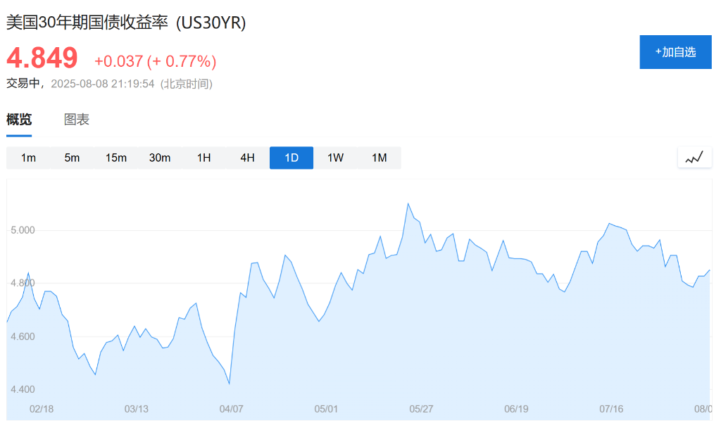 周五,美国30年期国债收益率小幅上行,目前在4.85%附近震荡,5年期收益率稳定在3.81附近。