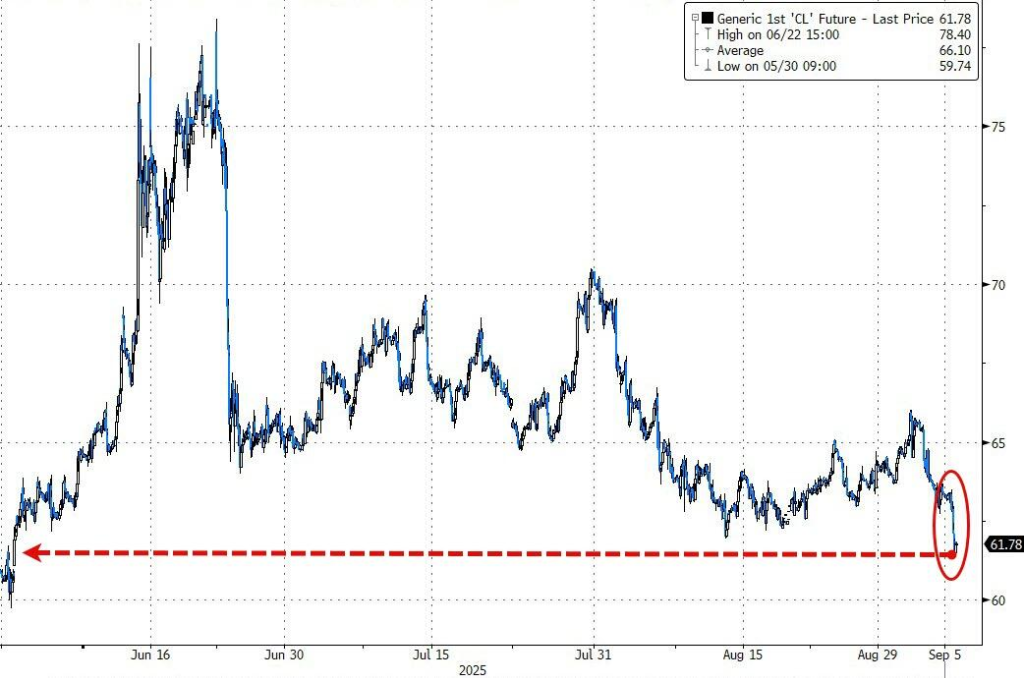 据华尔街见闻,美国8月非农数据惨淡,就业疲软引发原油需求担忧,叠加OPEC+周日可能增产的消息,周五原油价格延续本周颓势下挫2%,WTI原油期货一度跌至62美元下方,布伦特原油则跌至66美元关口。
