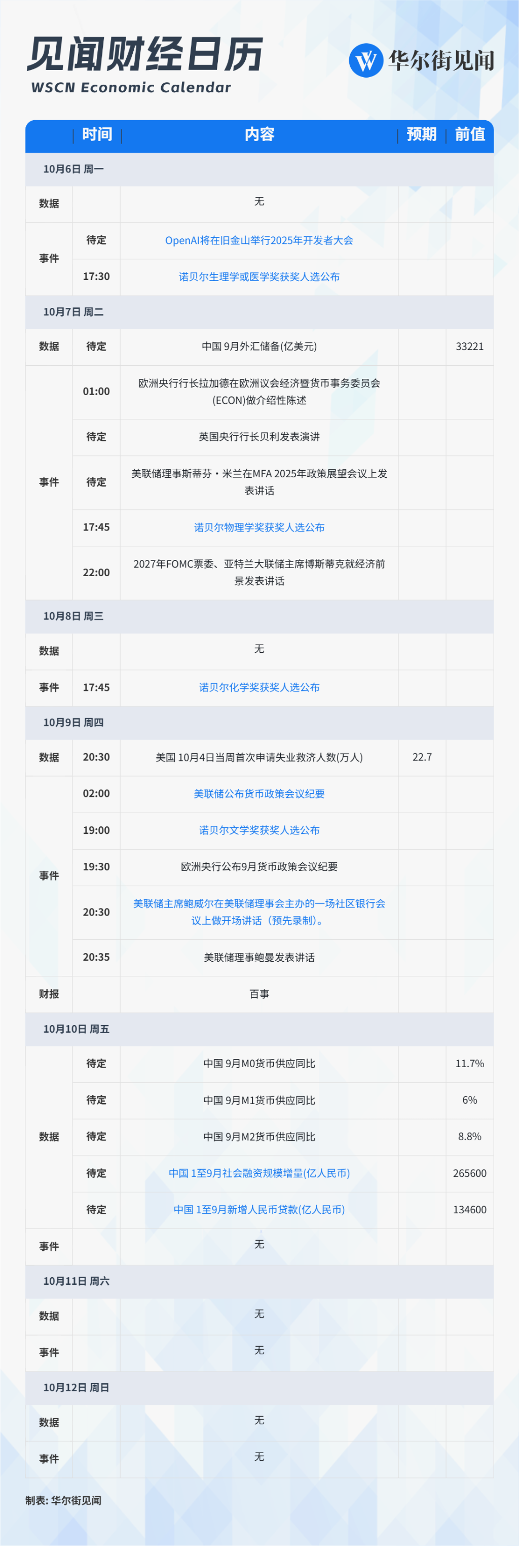 10月06日 - 10月12日当周重磅财经事件一览,以下均为北京时间: