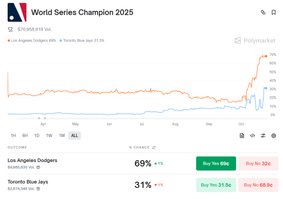 听起来颇为复杂,但从用户的方向,使用非常简单,用稳定币予以下注,问题与市场相对应,只有“是”与“否”二元的选项,预测正确则获1美元,错误则无,而在CTF框架下,价格就代表了事件发生的概率。例如若该投注是0.69美元,则代表投注事件发生的概率为69%。