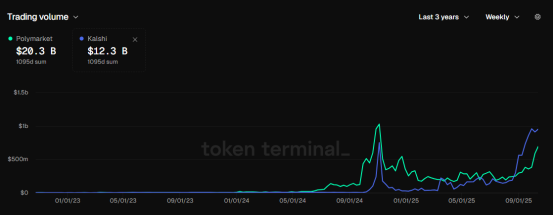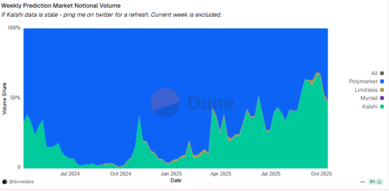 在问题之后,市场挑战也接踵而至。在预测市场,Polymarket与Kalshi呈现分庭抗礼之势,从差异化而言,前者玩法更加密原生,强调去中心化,预测领域涵盖更广泛,政治、经济、体育、娱乐等均有囊括,而后者则以合规为竞争力,是获得美国CFTC批准的合规交易所,对机构用户与圈外人士更具吸引力。尽管现下在交易量与品牌声量方向,Polymarket以绝对优势领先,但后者弯道超车之势明显,Kalshi通过Dune平台以每周名义交易量计算的市场份额从2025年1月的8%上升到2025年9月的66%,现虽回落至46.6%,但增长势头仍然迅猛。就连最近融资,Kalshi也不落其后,同样传出消息Kalshi正收到来自风险投资机构的融资要约,估值区间为100亿至120亿美元。