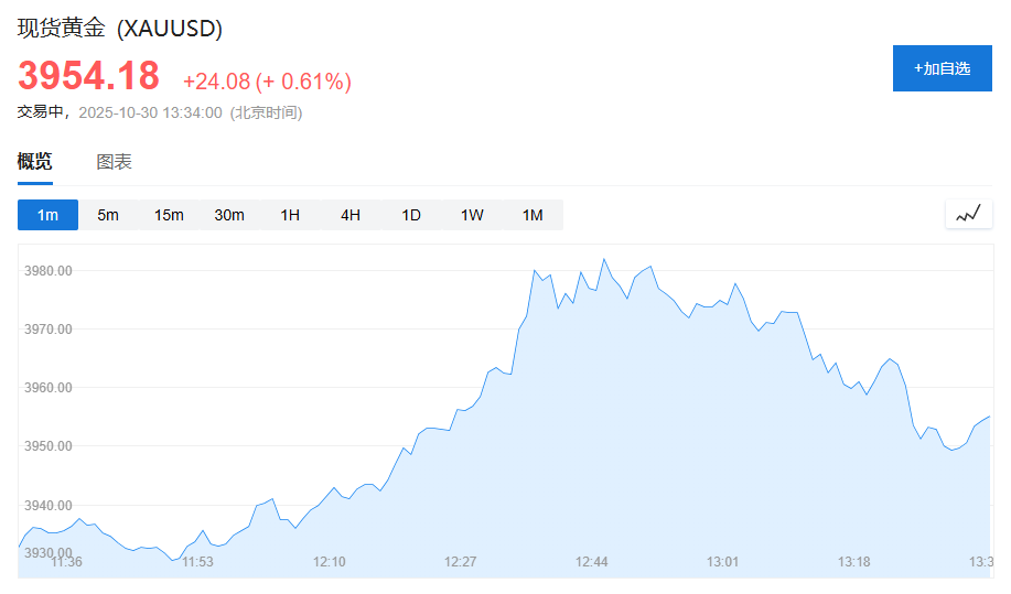 现货黄金涨幅涨幅一度扩大至1%,但随后涨幅收窄,现至0.61%。