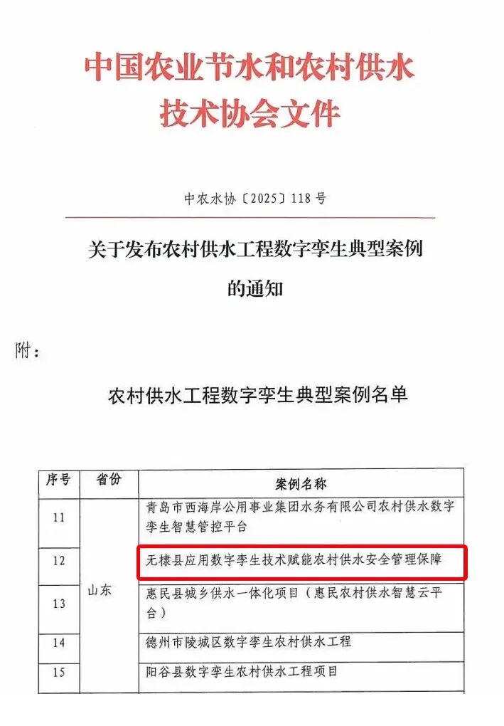 近日,中国农业节水和农村供水技术协会公布农村供水工程数字孪生典型案例名单,由智洋创新承建的数字孪生无棣农村供水系统成功入选。