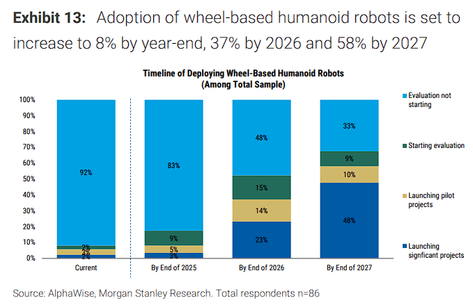 双足机器人则为2025年6%、2026年17%、2027年41%。
