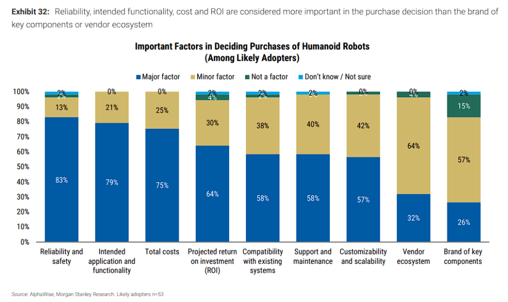 大摩调研显示,仅有23%的受访者对当前人形机器人产品表示满意,53%持中性态度,25%表示不满意。