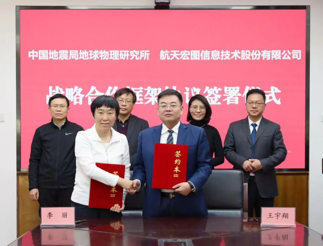 2025年12月5日,中国地震局地球物理研究所(简称:地球所)与航天宏图信息技术股份有限公司(简称:航天宏图)在北京签订战略合作协议,双方将在卫星星座、数据共享、人才培养等多个关键领域展开深度合作,携手推动防震减灾监测技术的创新发展。地球所李丽所长、航天宏图王宇翔董事长出席了签约仪式。