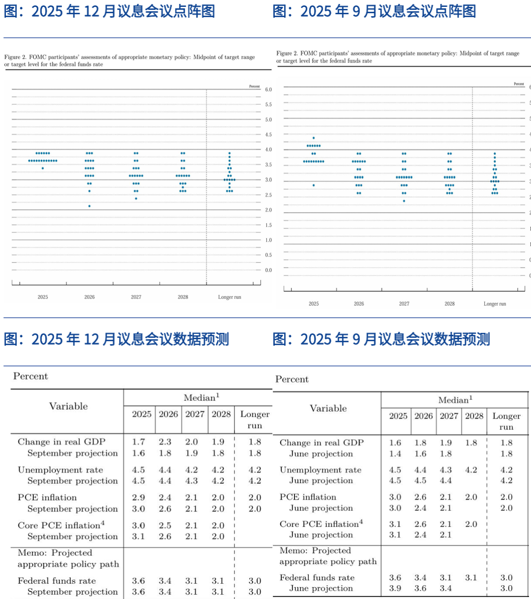 从会后公布的点阵图来看,美联储决策层的利率路径预测和三个月前公布点阵图时一致,依然预计明年会有一次25个基点的降息,即:2026年底的联邦基金利率为3.4%,2027年底联邦基金利率为3.1%,2028年底联邦基金利率3.1%,更长期的联邦基金利率为3.0%。点阵图整体仍然释放了明年的降息动作将较今年明显放缓的信号。