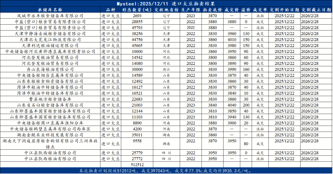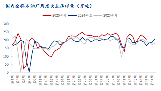 近期举行的进口大豆拍卖结果进一步强化了近月市场的成本支撑。 12月11日国家粮食交易中心举行的进口大豆拍卖成交表现强劲,计划拍卖51.25万吨(年份2022、2023年),实际成交39.7万吨,成交率高达77.5%,成交均价3935.3元/吨。标的分布在辽宁、天津、河北、浙江、山东、湖南、河南、四川等多个主要港口及消费区域,交货日期为2025年12月22日至2026年3月31日。这一成交结果显著高于市场预期,显示出市场对即期和近期大豆供应存在实质性需求,较高的成交均价也为近月豆粕价格提供了坚实的成本底线支撑。