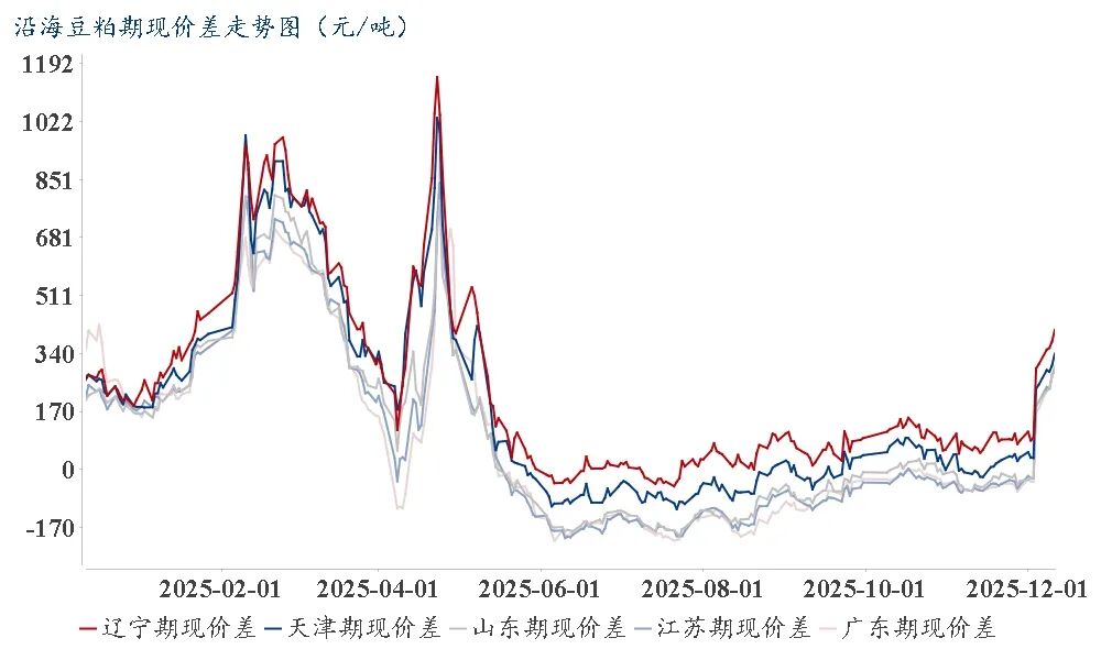 尽管进口大豆拍卖成交活跃,但考虑到国内庞大的月度压榨需求,此次拍卖成交的39.7万吨大豆仅能部分缓解区域性供应紧张,难以改变整体供应格局。现货市场方面,供应压力持续释放但区域分化显著。一方面,由于前期到港大豆集中,油厂豆粕库存普遍高企,部分油厂因库存压力被迫停机催提;另一方面,少数油厂因大豆到港延迟或断豆出现停机,导致区域性供应紧张。这种分化使得现货价格在盘面反弹背景下表现出一定抗跌性。