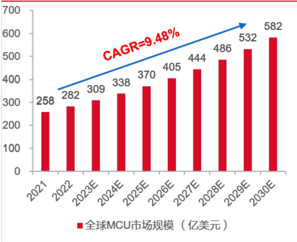 近年来,全球MCU市场规模持续增长。2024年全球MCU市场规模达到197亿美元,2020 - 2024年复合增长率为6.3%。2025—2030预计年年化复合增速9.5%,2030年有望达582亿美元。