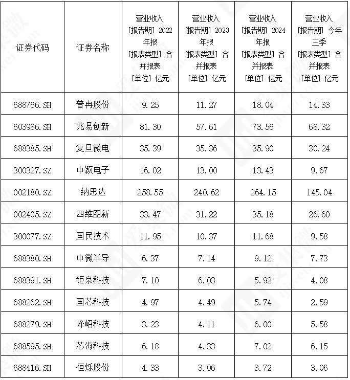 2025 年前三季度,营业总收入前三的企业为纳思达(145.04 亿元)、兆易创新(68.32 亿元)、复旦微电(30.24 亿元)。