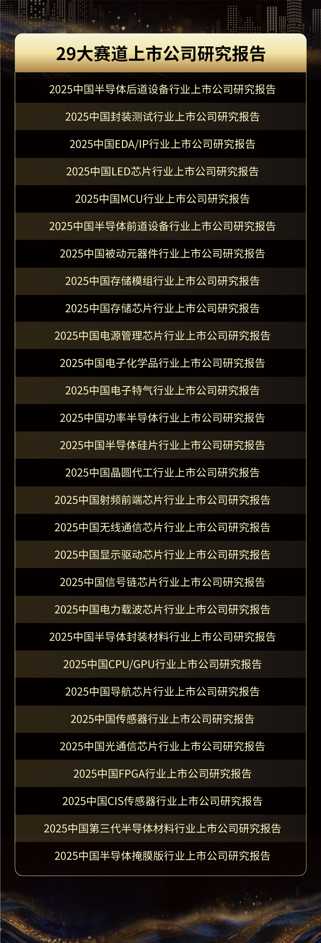 《报告》将于2025年12月20日在“2026半导体投资年会暨IC风云榜颁奖典礼”上进行详细解读。同期,该典礼还将揭晓首届“年度半导体上市公司领航奖”的评选结果。该奖项覆盖晶圆代工、封装测试、EDA/IP、半导体硅片、电子特气、信号链芯片、存储芯片、功率半导体等31个半导体关键细分领域,旨在发掘在技术创新、市场增长与产业引领方面表现卓越的上市公司。奖项的设立,基于行业形成的共识:中国半导体上市公司体系已逐步完善,各细分领域领军企业集结成形,正成为推动全球半导体发展的重要力量。