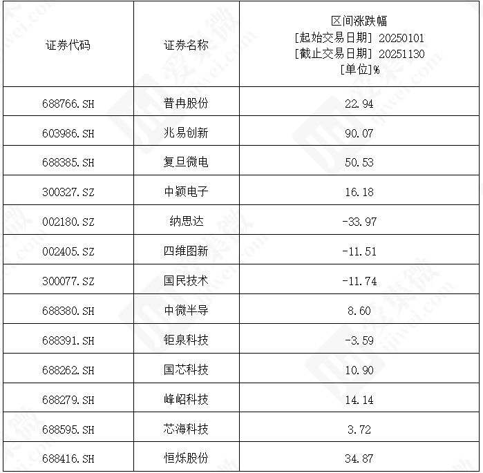 截至11月30日,涨幅最高的公司为兆易创新(90.07%);涨幅最低的公司为纳思达(-33.97%)。总市值最高前三名为兆易创新(1355.73 亿元)、复旦微电(409.73 亿元)、纳思达(264.47 亿元)。市盈率前三名为兆易创新(122.96)、中微半导(95.00)、峰岹科技(92.96)。