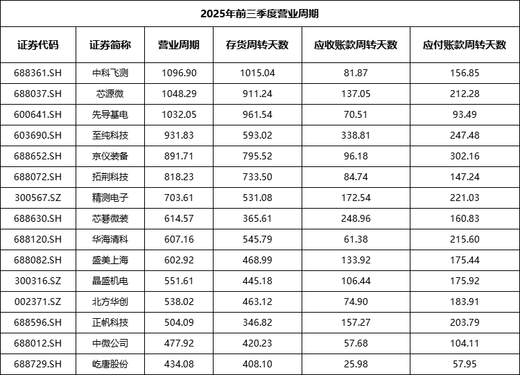 从营业周期来看,营业周期由长至短前三的是中科飞测、芯源微、先导基电。