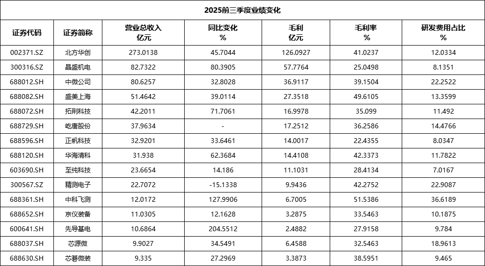从毛利润表现上看,盈利前三的企业分别是:北方华创、中微公司、盛美上海。