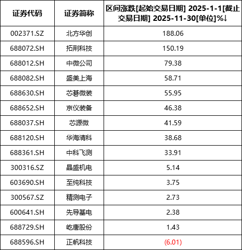 2025年,半导体前道设备行业股价表现多数收涨,截至11月30日,涨幅最高的公司是北方华创(188.06%),跌幅最高的公司是正帆科技(-6.01%)。