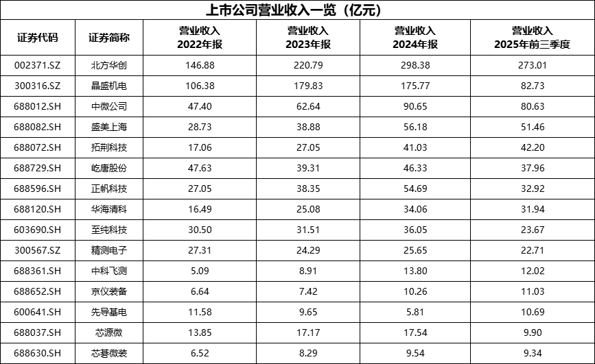 从营收表现来看,营业收入前三的企业分别是北方华创、晶盛机电、中微公司。