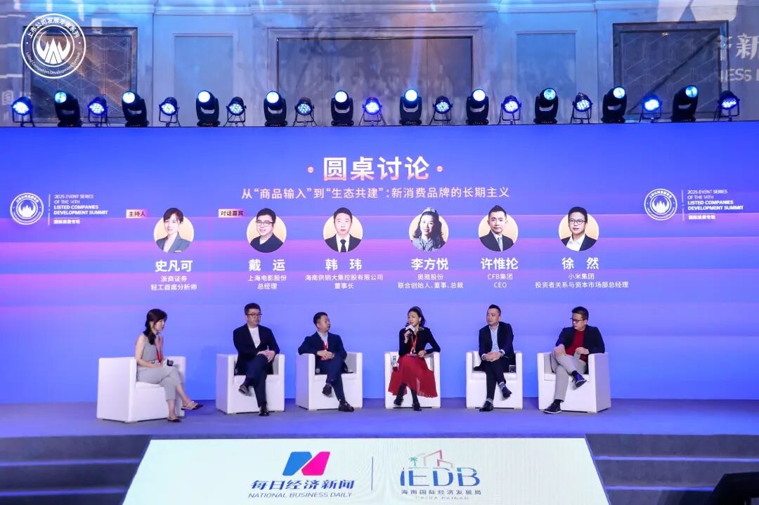 本场圆桌论坛由浙商证券轻工首席分析师 史可凡 女士主持,奥雅股份联合创始人、董事、总裁 李方悦 女士、上海电影股份总经理 戴运 先生、海南供销大集控股有限公司董事长 韩玮 先生、CFB集团CEO 许惟抡 先生、小米集团投资者关系与资本市场部总经理 徐然 先生对话讨论,共同围绕从“商品输入”到“生态共建”:新消费品牌的长期主义展开对话。