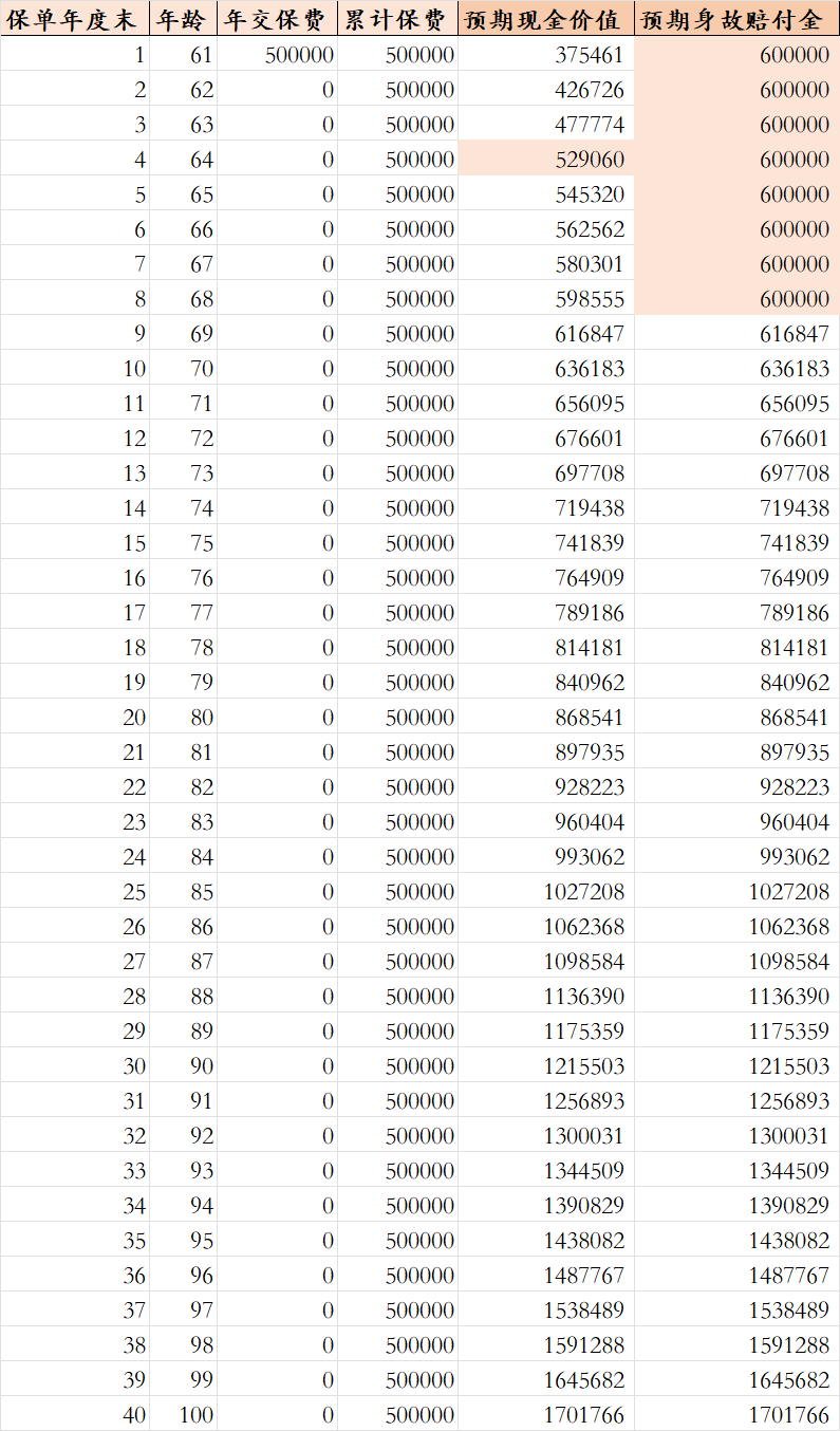 下图是假设老人60岁,一次投保50万元增额寿对应的数据。