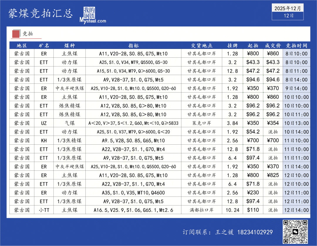 挂牌3场总计5.76万吨中灰半硬焦煤起拍价350元/吨,较上周持平,最高成交价370元/吨,较上周最高成交价持平,成交均价367元/吨,较上周均值下跌3元/吨。自2025年初截至本周五12月19日,ER公司共挂牌142场中灰半硬焦煤,总计数量272.64万吨,成交数量126.72万吨,成交占比46.48%。