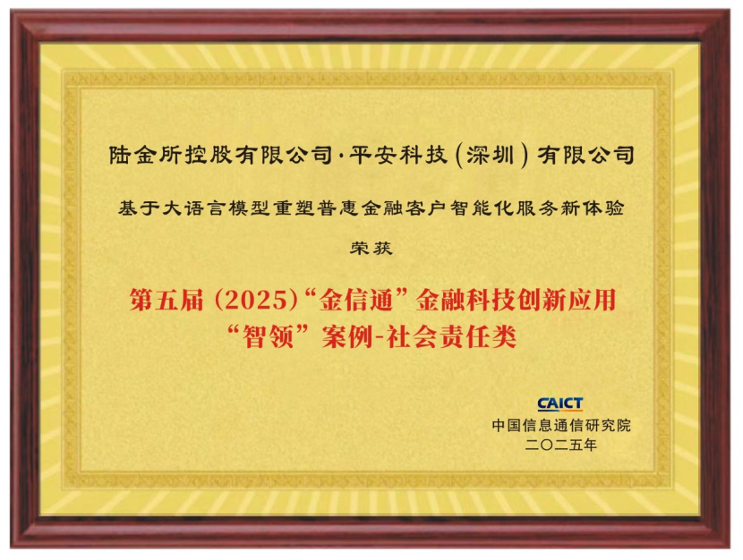 近日,由中国信息通信研究院主办的第五届(2025)“金信通”金融科技创新应用典型案例评选结果正式发布。陆控消保部智能客服团队联合平安科技打造的《基于大语言模型重塑普惠金融客户智能化服务新体验》项目暨“智能客服3.0”,从702个参选案例中脱颖而出。以其智能体解决方案、创新技术应用成效,获评为“金融科技创新应用‘智领’案例”。