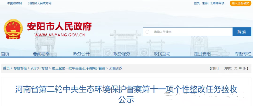 近日,安阳省人民政府网站发布《河南省第二轮中央生态环境保护督察第十一项个性整改任务验收公示》一文。