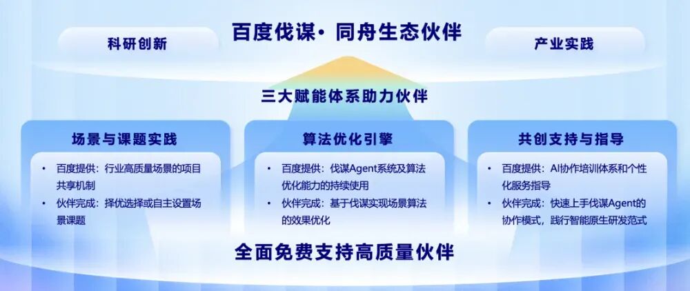 12月25日,百度伐谋正式发布“同舟生态伙伴计划”,面向高校实验室、行业软件企业,开放高质量行业场景与课题,共享伐谋Agent系统及算法优化引擎,并提供AI协作培训与个性化服务指导。