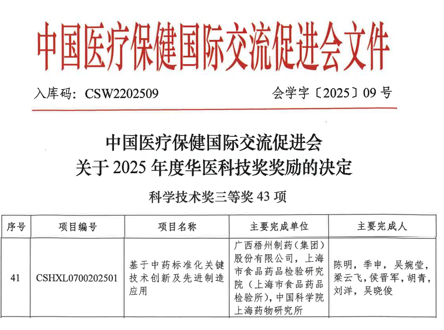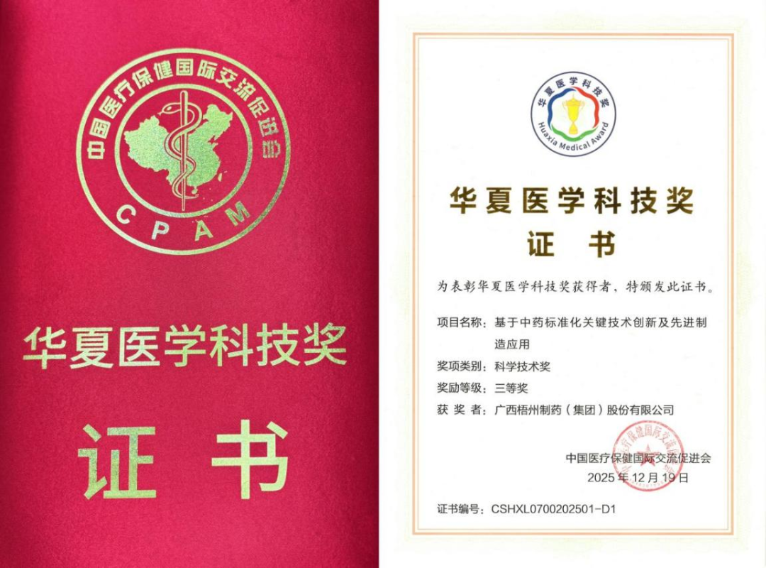12月20日,2025年度华夏医学科技奖颁奖大会于北京召开,由中恒集团旗下梧州制药牵头完成的《基于中药标准化关键技术创新及先进制造应用》项目荣膺华夏医学科学技术奖三等奖。此次获奖创下了三项“唯一”:该项目是获奖名单中唯一聚焦中药产业化应用领域的成果;牵头方梧州制药既是唯一来自广西的获奖者,也是唯一以中药企业身份担当的牵头单位。这一突破性成果,充分彰显了中恒集团在中药标准化领域的核心创新实力与行业引领地位。