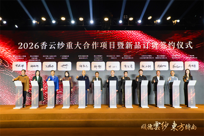 在同期举办的2026香云纱重大产业合作项目暨新品订货签约仪式上,11个项目集中签约,合作总金额达1.89亿元,覆盖文化产业、战略合作、产业链协同及数字溯源等多个领域,展现出香云纱产业强大的商业吸引力和跨区域合作潜力。重要合作包括:广东省丝绸纺织集团香云纱有限公司与江苏上久楷丝绸有限公司达成合作,实现宋锦与香云纱两大“非遗”技艺的融合创新;佛山市顺德区时耐莨绸文化发展有限公司将携手北京鸟巢《远航天梦》太空博物馆研发制作太空类文创产品和服装,并借助鸟巢向世界展示顺德香云纱文化价值,还将携手广东博融和创投资集团、佛山市中营人工智能科技有限公司,利用AI技术开发智能家居产品“智枕云纱”,推动“非遗+科技”跨界融合。