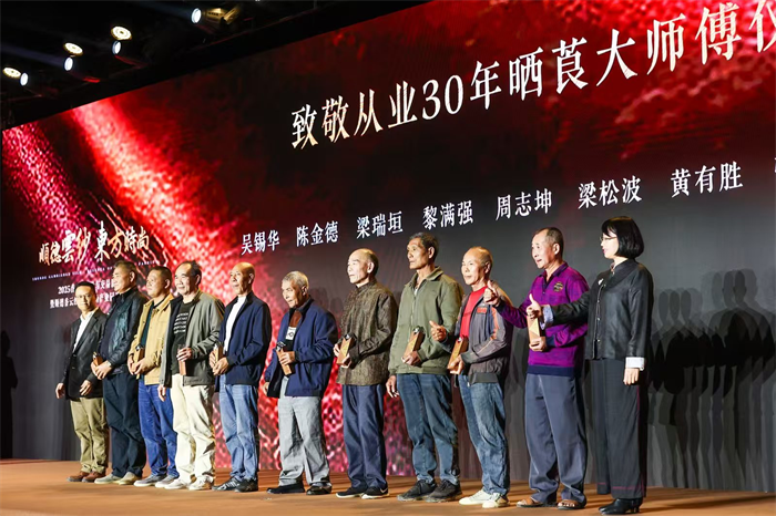 如今,它以历久弥新的面貌在当代焕发光彩,背后离不开一代代“非遗”传承人与晒莨大师傅的坚守。活动中特别向9名从业满30年的“晒莨大师傅”致敬,彰显顺德对工匠精神与技艺传承的尊崇。