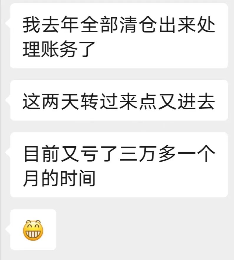 本来都清仓不玩了,打算用工资老老实实还贷款,但一想到每个月工资只能用来填利息,没到一个月又冲进去,结果1个月又亏3万。