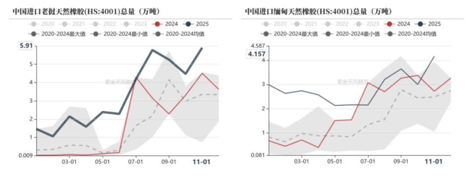 零关税政策下进口老缅柬橡胶数量大幅提升:自2024年12月1日起,对原产于同中国建交的最不发达国家100%税目产品适用税率为零的特惠税率。其中除33个非洲国家(不含科特迪瓦)之外,亚洲国家包含缅甸、老挝、尼泊尔、东帝汶、阿富汗、孟加拉国、柬埔寨、也门;此前,自这些国家进口天胶需缴纳20%的最惠国税率关税。