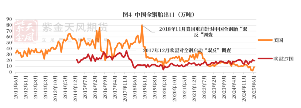 (1)对中国轮胎出口影响有限:由于长期受“双反”等贸易壁垒影响,中国轮胎对美国市场的出口量和占比早已降至低位。