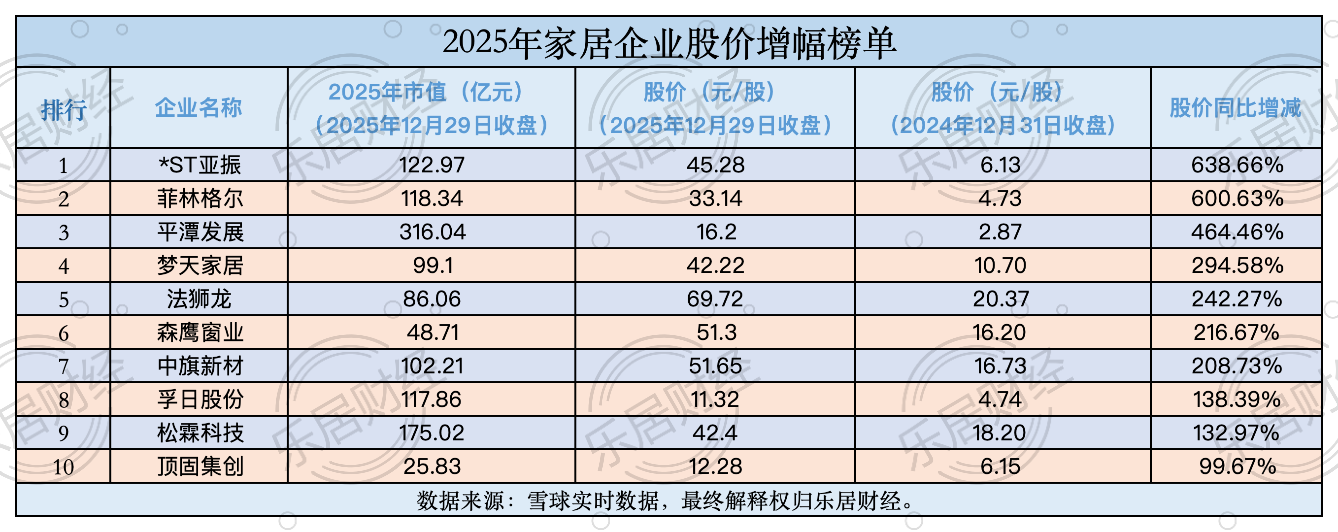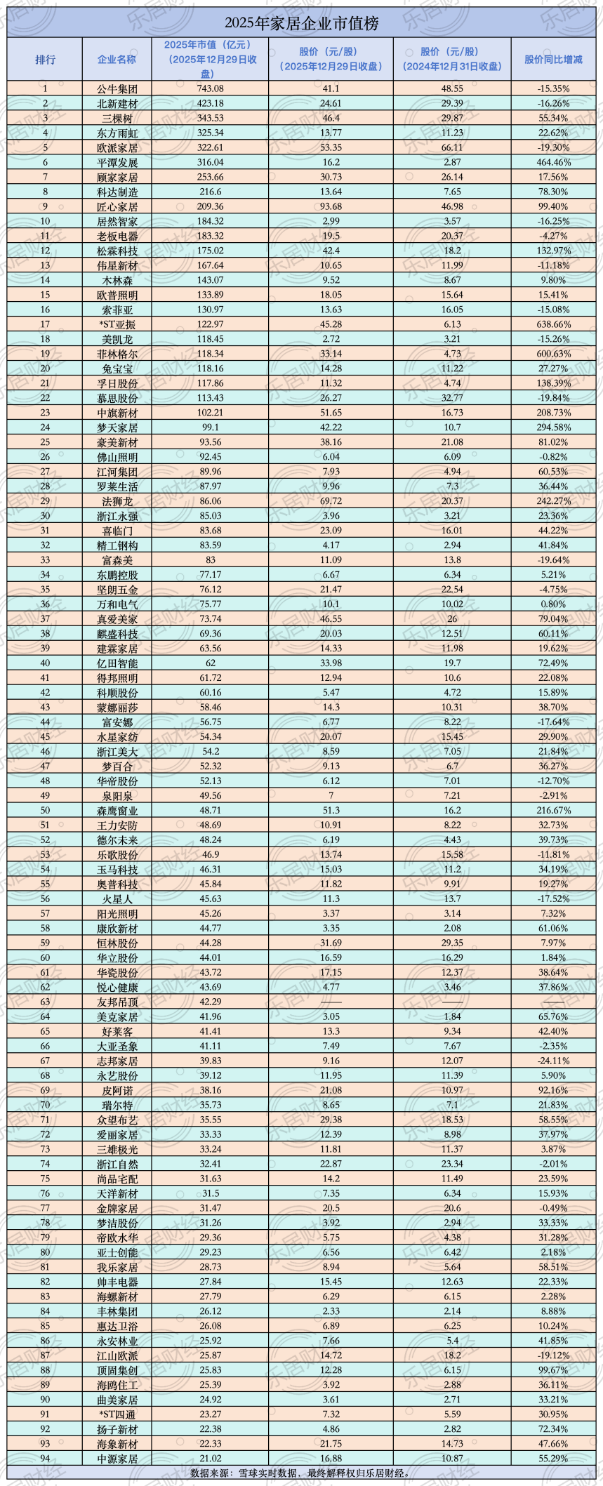 在股价指标上,乐居财经对比了94家企业2024年12月31日的收盘股价,以及2025年12月29日的收盘股价,以一年时间的跨度,直观展现出2025年全年,家居行业股价整体呈现“复苏态势”。