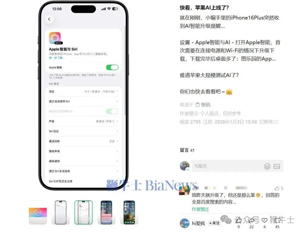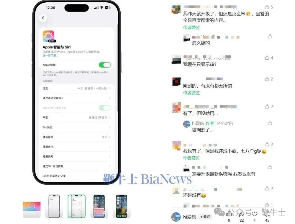 此前,据数码博主“hi爱疯”昨日透露,苹果公司已在近期针对部分国行设备启动“Apple智能与Siri”功能的灰度测试。