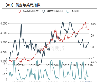 上周美元指数与黄金价格反向变动,黄金上周下跌4.4%,美元指数上涨0.4%至98.5,两者滚动相关性上升。