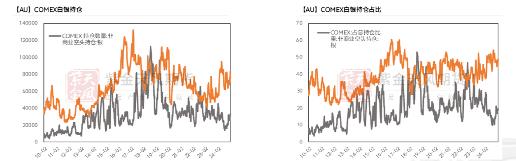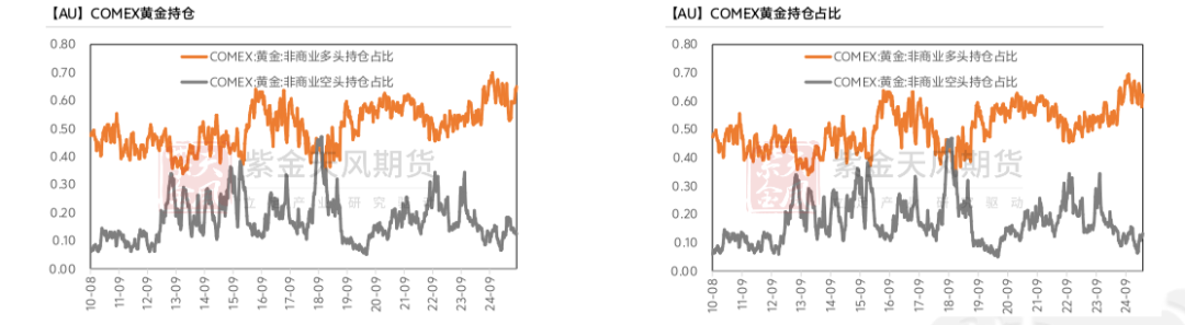 持仓占比方面,非商业多头持仓减少至59%附近,非商业空头持仓维持到10%附近。