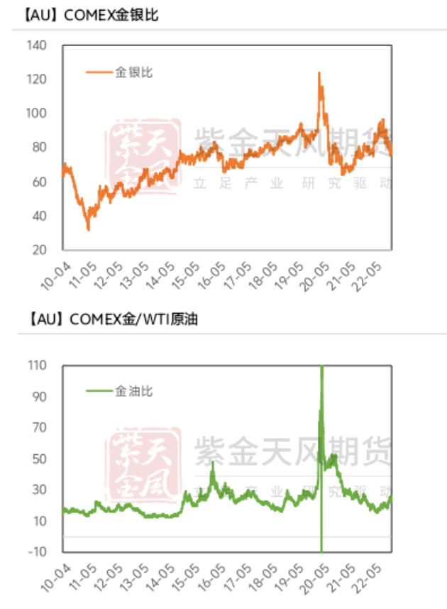 金银比震荡走低,主要因为上周黄金上涨幅度小于白银;金铜比走高,主要因为上周黄金上涨幅度大于铜;金油比环比走高,主要因为上周原油上涨幅度小于黄金。