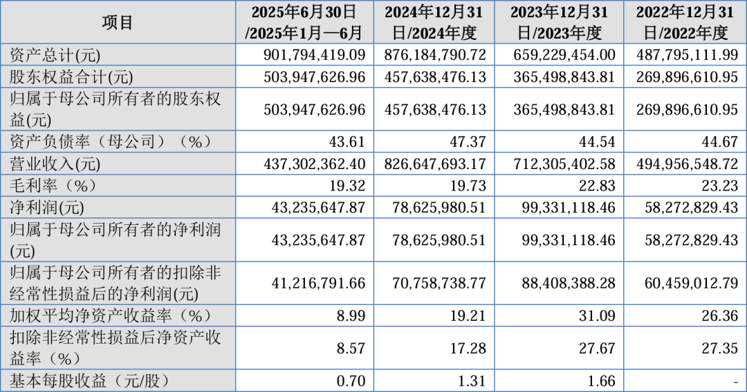财务数据显示,公司近年来业绩增长显著。2022年至2024年,公司营业收入分别为4.95亿元、7.12亿元和8.27亿元,年复合增长率达29.23%;净利润分别为5,827.28万元、9,933.11万元和7,862.60万元。2025年1-6月,公司实现营业收入4.37亿元,同比增长23.47%,净利润4,323.56万元,同比增长52.36%,主营业务发展趋势良好。