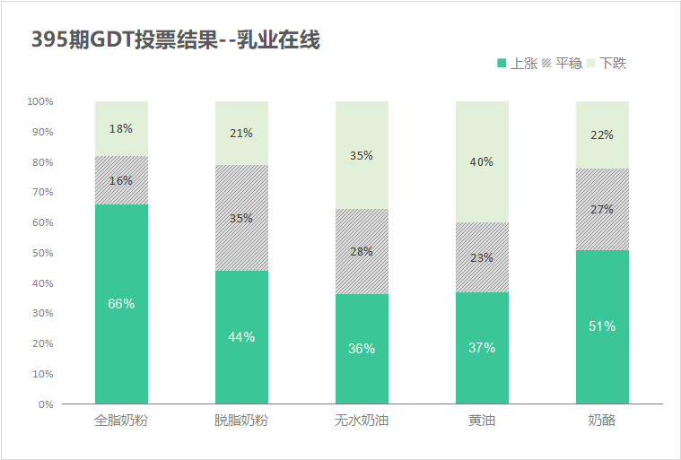 在1月6日第395次拍卖盘前分析中,我们发出了关于全脂奶粉、脱脂奶粉、奶酪、黄油、无水奶油价格走势预测的投票。投票结果如下:
