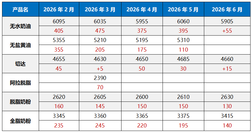 2026年2月-2026年6因为进入产季后半段,投放总量下滑,同环比均减少,无水奶油成为减量主力。虽然节前现货反弹,中国买家本次表现平淡,但中东和非洲买盘活跃,推动本次拍卖大涨,各品种无一下跌,全脂无水暴力反弹,本次总体大涨6.3%,成交均价3533美元/MT,成交量29282吨,14%;参与户数大幅度回升。